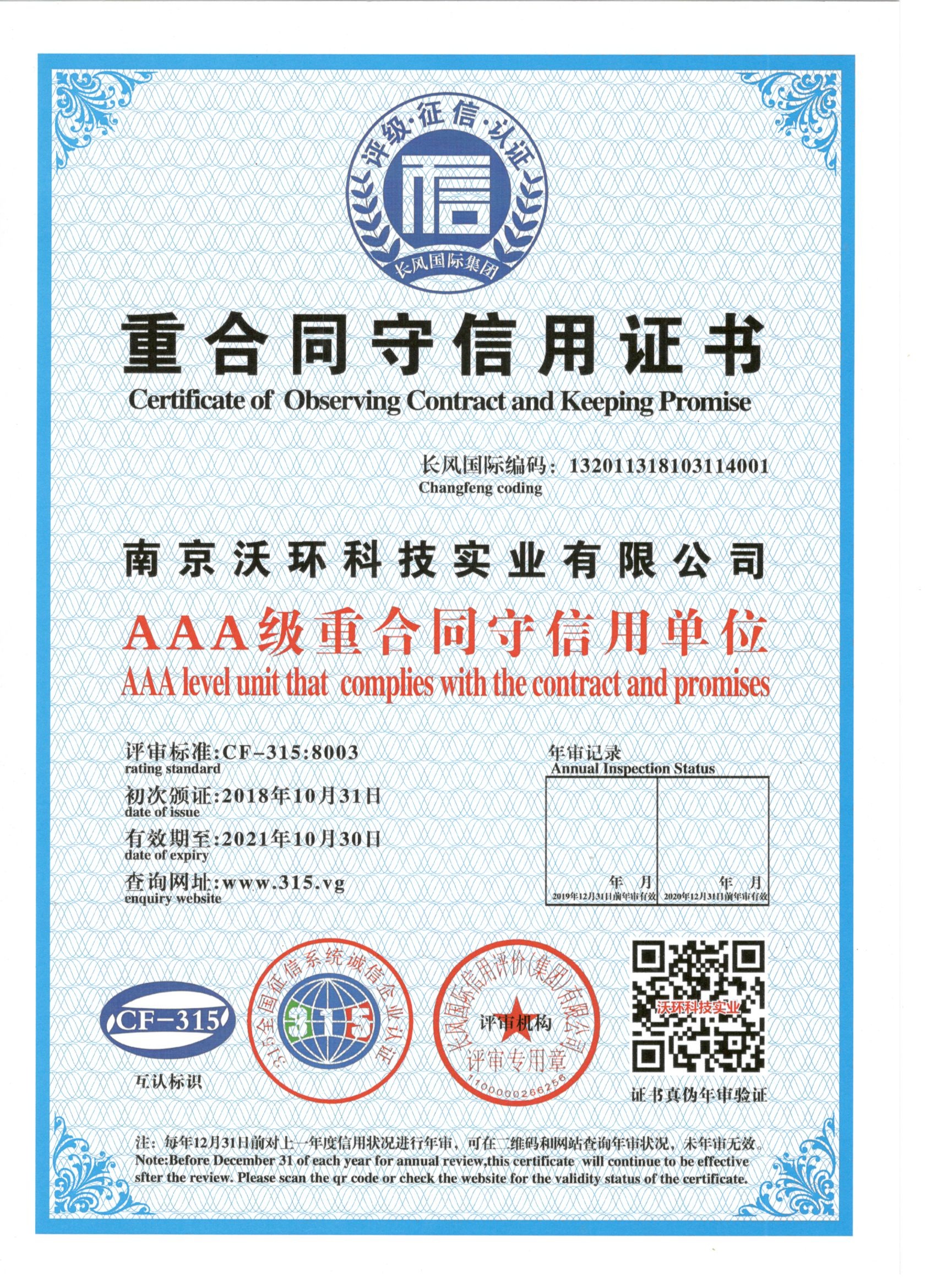 熱烈祝賀南京沃環(huán)公司被專業(yè)評(píng)審機(jī)構(gòu)-長(zhǎng)風(fēng)國(guó)際集團(tuán)評(píng)為AAA級(jí)重合同守信用單位,特發(fā)此證書(shū)